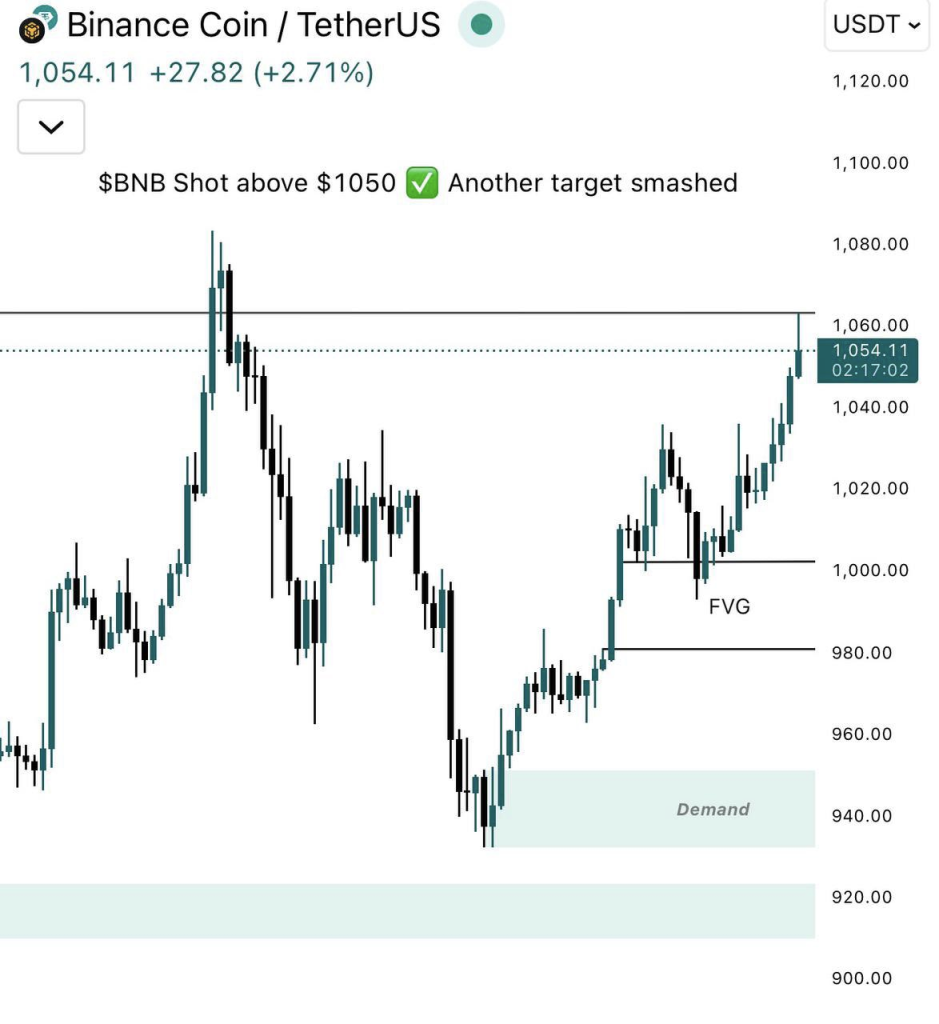 分析师Cipher X观察到,BNB突破1050美元具有里程碑意义。该分析师强调,1000美元和900美元支撑位依然稳固,表明买方仍主导市场,预计第四季度积极情绪将随BNB动能增强而持续。