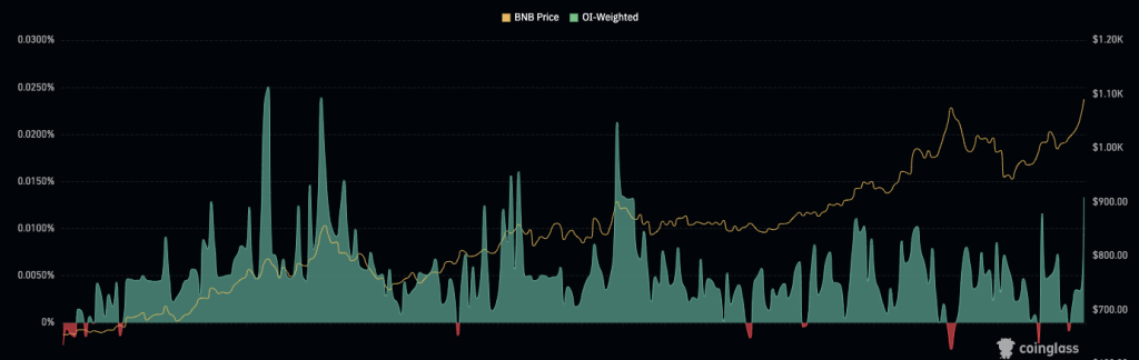 BNB持仓量加权资金费率近期呈现显著波动。当价格突破1100美元时,资金费率急剧攀升,显示衍生品市场活跃度激增。该指标反映持仓成本,其峰值与谷值往往与价格波动同步。