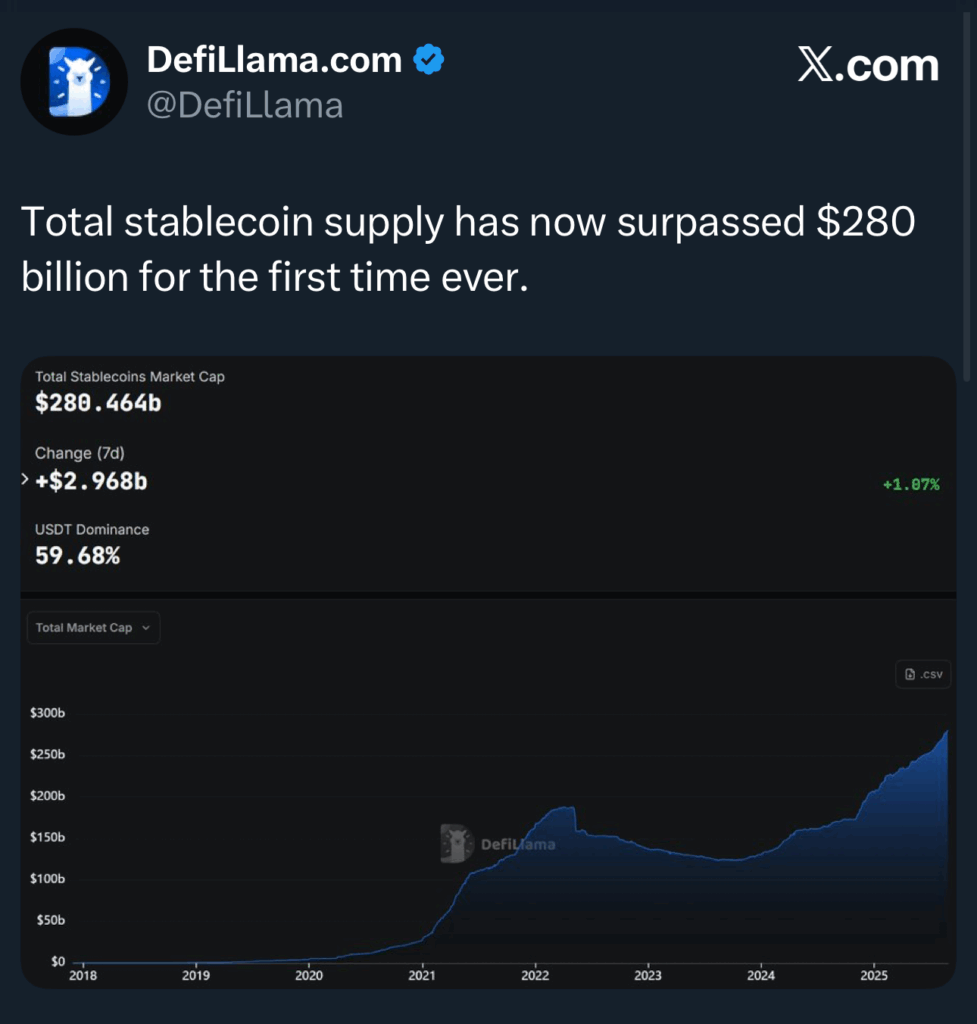 根据DefiLlama数据,稳定币总供应量已攀升至2804.6亿美元。这一纪录主要由