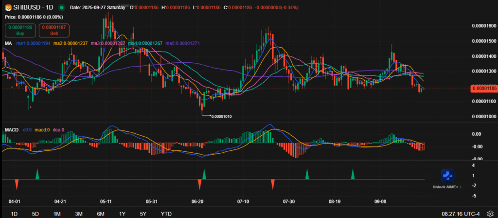 日线图显示SHIB现报0.00001186美元,略高于近期低点0.00001010美元。20日与50日均线构成上方阻力,价格需有效突破这些关口才能扭转势头。MACD指标双线位于零轴下方,红色柱状图显示短期空头仍占优。