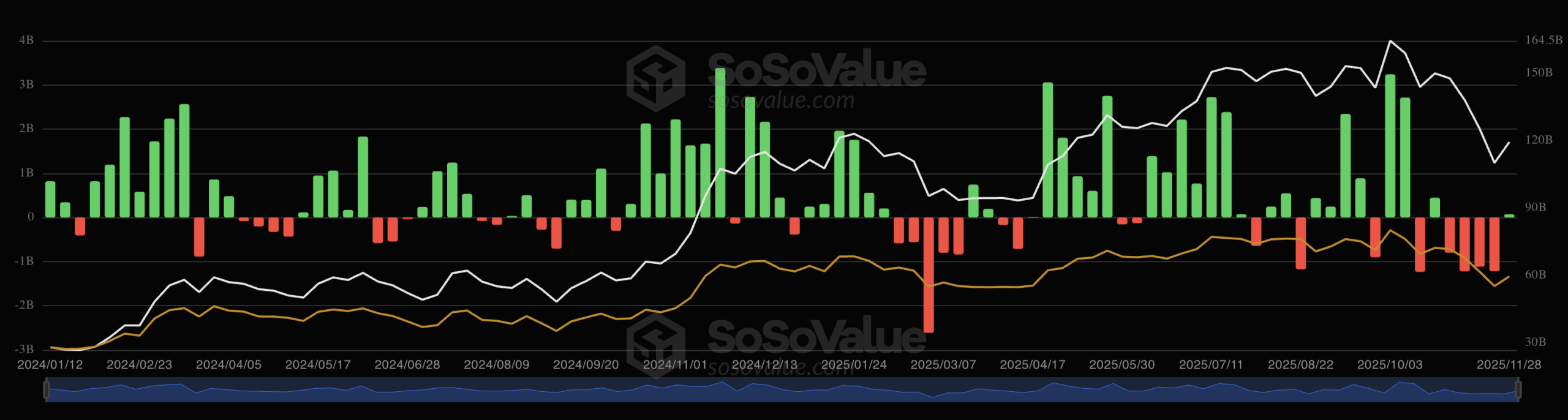 以太坊ETF出现相似趋势,11月流出14.2亿美元,创下迄今最大单月流出纪录。但该月最后五天连续出现资金流入,显示出部分复苏信号。