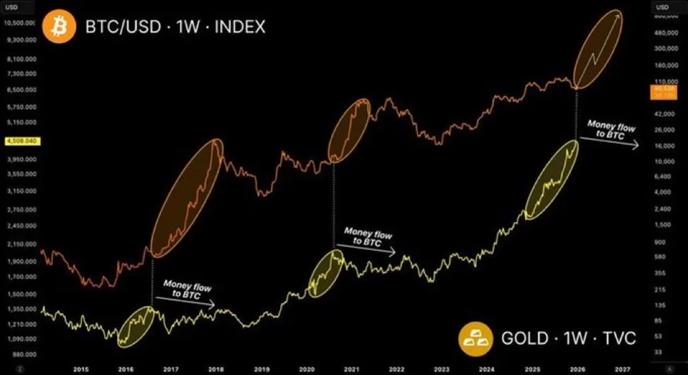 历史定价数据显示,比特币价格往往在黄金牛市阶段后迎来上涨。这与贵金属价格已过热、可能面临获利了结的事实相符。