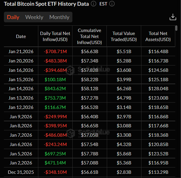 现货XRP与Solana ETF则呈现资金流入。1月21日,美国比特币与以太坊现货交易所交易基金(ETF)出现显著资金外流:比特币ETF流出约7.09亿美元,以太坊基金流出约2.87亿美元,创下本月单日最大赎回规模之一。两者合计流出金额接近10亿美元,为自一月初以来的最高单日流出纪录。