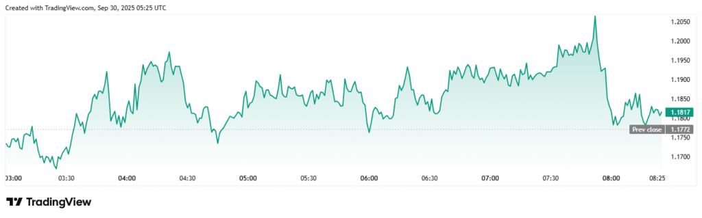 尽管日内波动曾短暂推高价格至1.20美元上方,但LDO最终收于前收盘价1.18美元附近。虽然急剧的回调抑制了上涨动能,但相较于前期收盘价仍显示出净强势。买家在1.18美元附近保持活跃,防止价格深度回调。