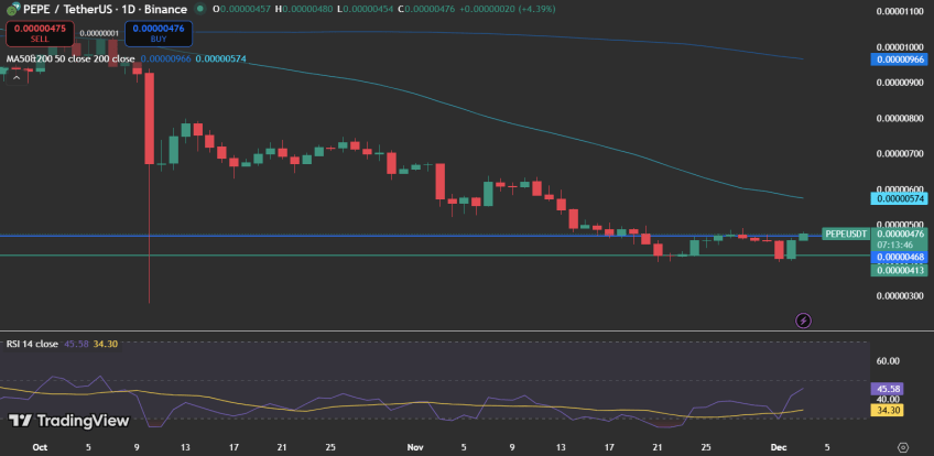 PEPE近期在0.00000413-0.00000468美元区间展现出强劲支撑,这在整体市场下行背景下有效维持了买盘兴趣。该代币从超卖状态的复苏点燃了交易者的乐观情绪。