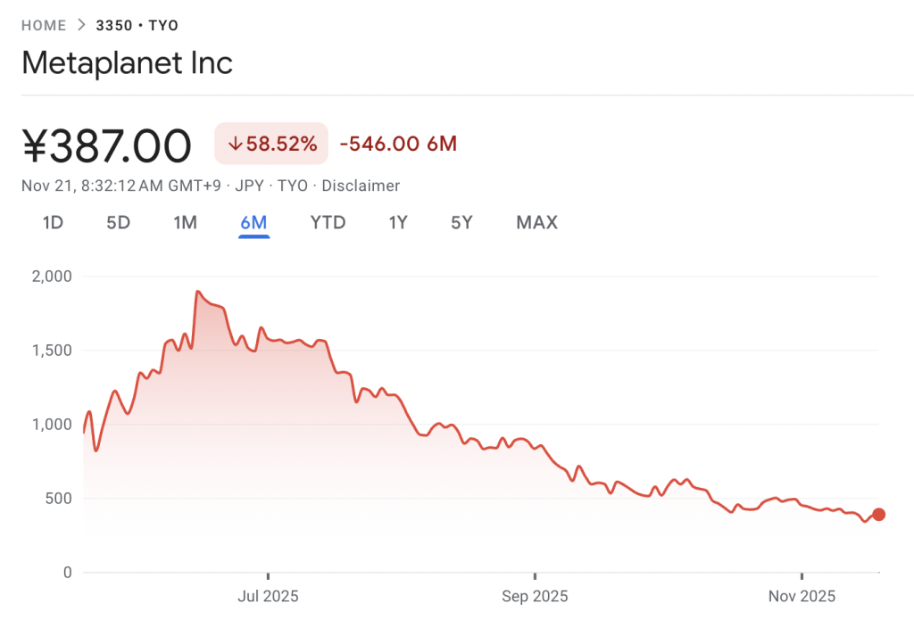 日本最大企业比特币持有者Metaplanet计划筹集约1.35亿美元继续增持BTC,尽管当前比特币价格低于9万美元关口。该公司选择通过发行优先股而非普通股进行融资,此举似乎旨在防止股价进一步下跌。根据谷歌财经数据,Metaplanet股价过去六个月已暴跌近60%,目前报387日元(约合2.46美元)。