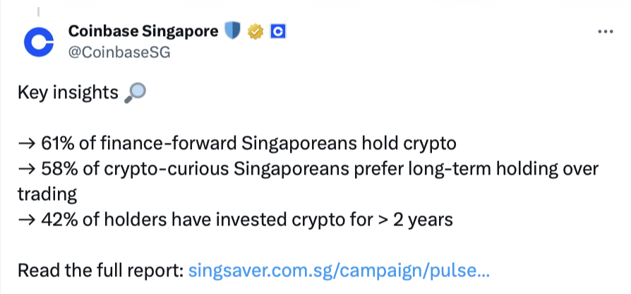 Coinbase与MoneyHero最新联合调查显示,加密货币正在新加坡加速普及。调查结果显示,该国活跃零售投资者中近三分之二持有加密资产,61%受访者在调查期间持有加密货币,表明加密参与已突破小众圈层,正成为新加坡大众理财的组成部分。