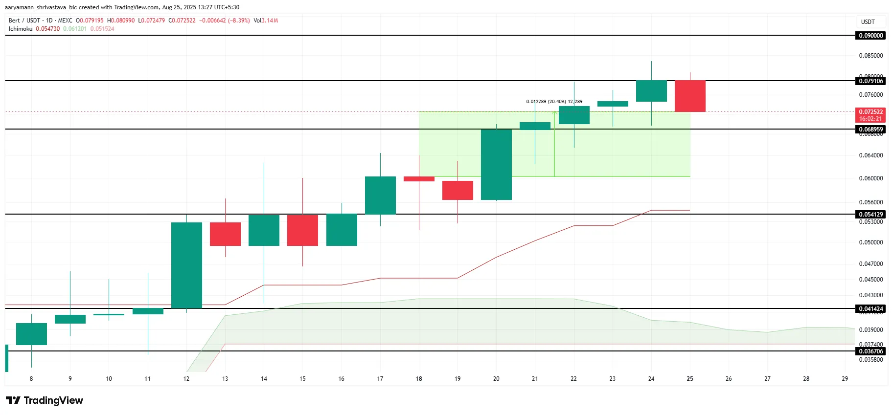 在大盘疲软背景下,现价0.0752美元的BERT展现出惊人韧性。云图指标显示其上涨动能充足,若突破0.079美元并转化为支撑,有望冲击0.09美元目标价位。