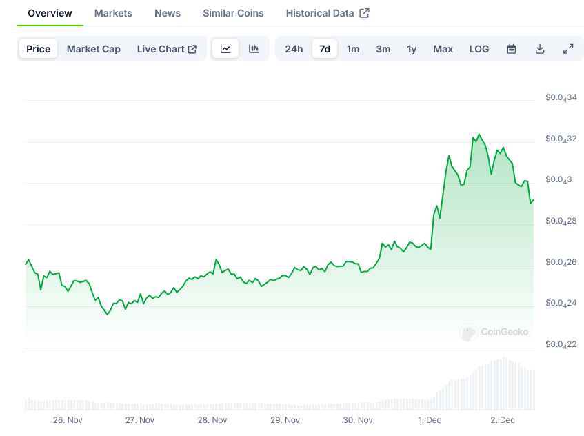 该加密货币目前面临0.00003美元的阻力位,在该价位观察到一些获利了结。最新数据显示,过去24小时内价格下跌3.8%,但该通证在较长时间框架内仍保持强劲涨幅。