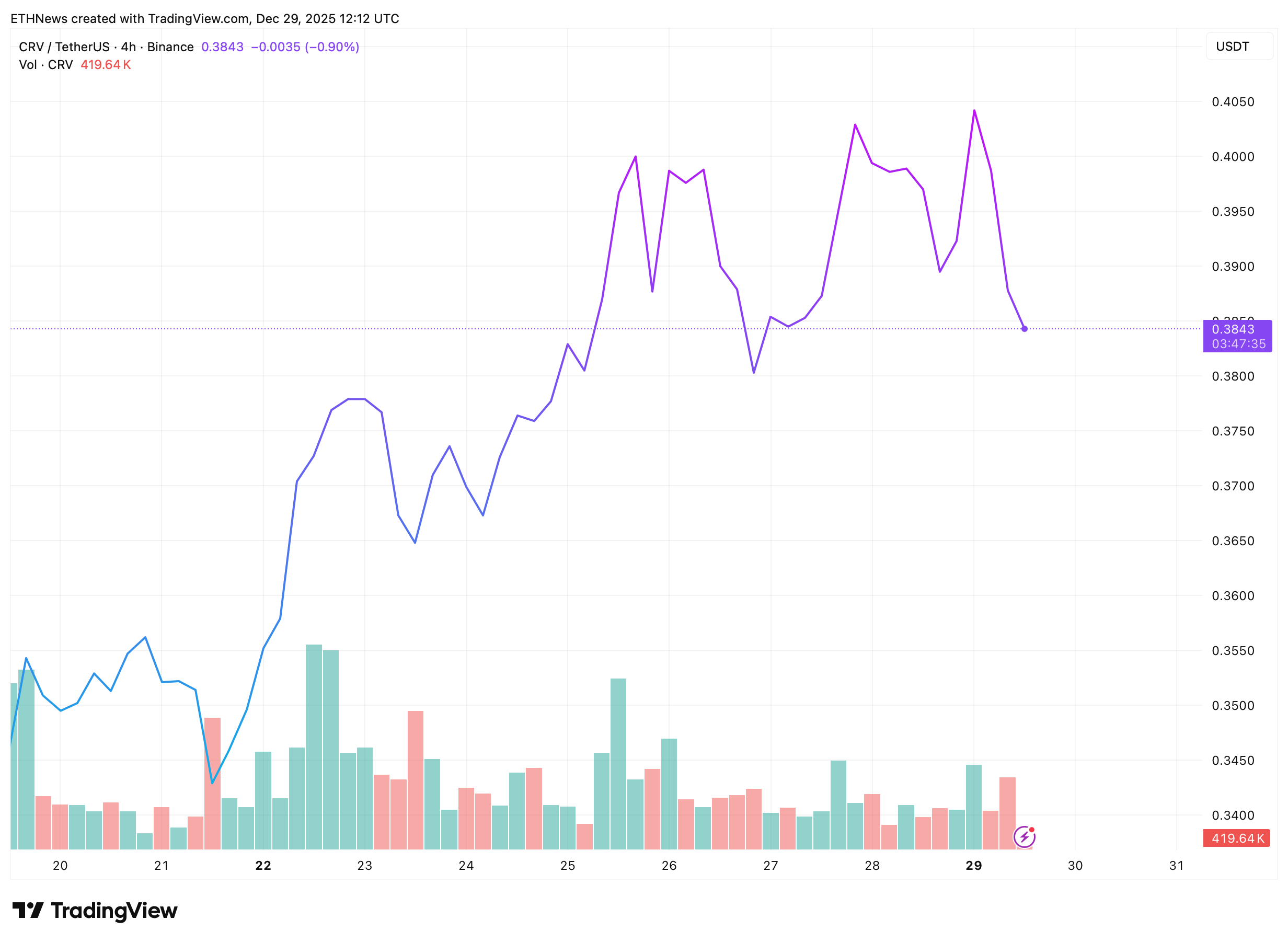 截至撰稿时,CRV交易于0.384-0.385美元附近,较近期0.40-0.41美元区间的局部高点有所回落。此次下跌属于受控回调而非恐慌性抛售,暗示市场正处于筹码派发和再平衡阶段。