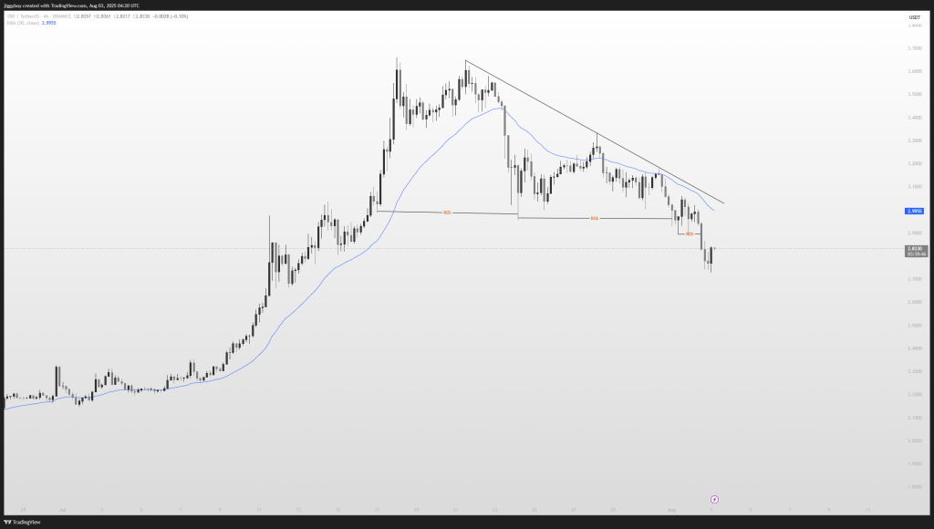 7月触及3.60美元高点后,XRP价格大幅回调,目前交投于2.82美元附近。虽然从2.77美元的小幅反弹让多头稍获喘息,但整体下行趋势尚未改变。