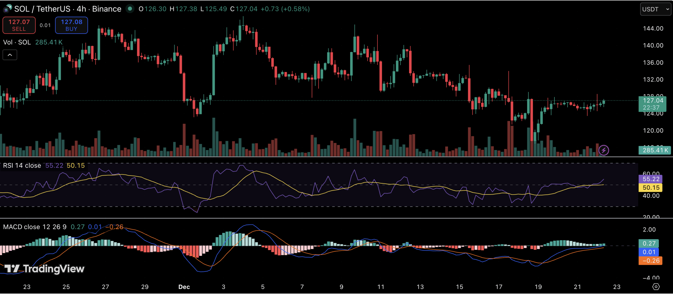 从技术指标角度看,信号仍显矛盾。在4小时图上,RSI略高于中性水平,表明动量均衡而非任何一方力量衰竭。与此同时,MACD在经历长期看跌阶段后开始走平,这种形态通常与整理蓄势和初步企稳相关,而非立即趋势反转。