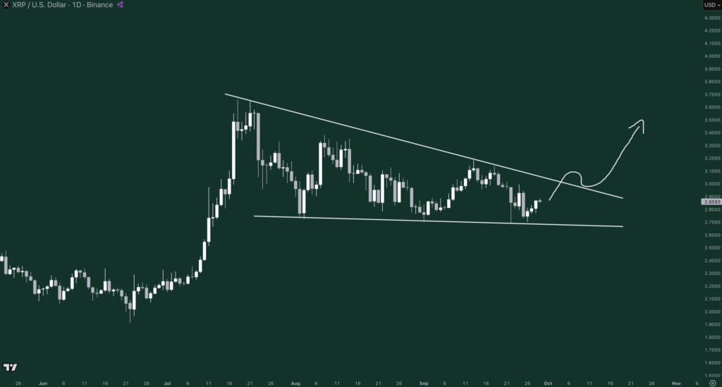 Altcoin Gordon分享的XRP/USD图表显示下降三角形形态,表明XRP正接近突破节点。价格近期测试2.85美元支撑位后,若突破阻力趋势线或将启动显著上涨。
