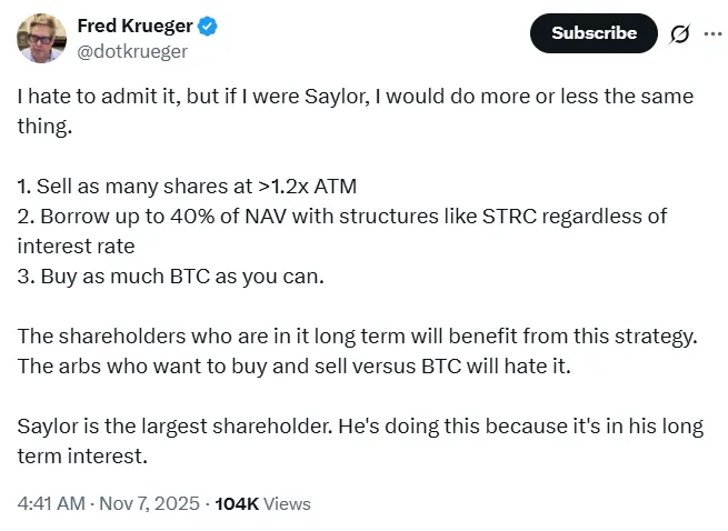 宏观分析师弗雷德·克鲁格在X平台发文称,MicroStrategy(MSTR)增持比特币的计划依然稳固。他表示若身处迈克尔·塞勒的职位,将采取相同策略——当股价高于交易均值时出售股票,通过特殊结构借入约40%资产价值,并将资金用于增持比特币。