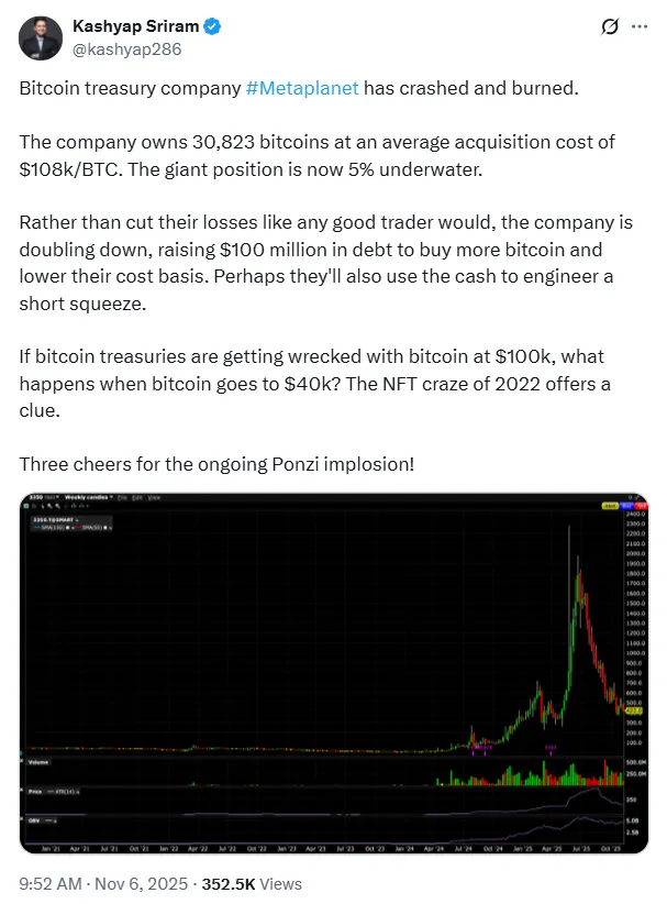 Metaplanet未选择割肉止损,反而举债1亿美元继续增持比特币以降低平均成本。此举引发分歧:部分分析师将其类比2022年NFT泡沫期的冒险行为,另有声音警告若比特币继续下跌,重仓企业可能面临保证金追缴。