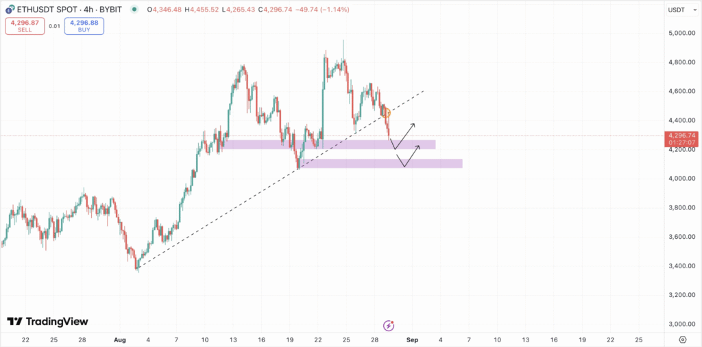 以太坊当前坚守在4100-4200美元需求区间上方。虽然本周初跌破了短期上升趋势线,但尚未失守关键支撑位。