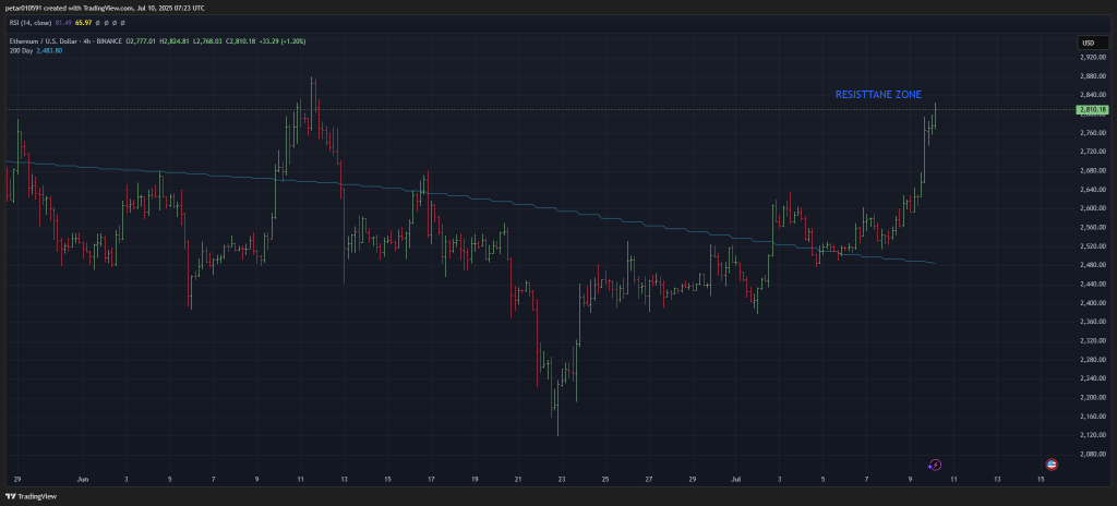 当前2810美元价位至关重要。以太坊正在测试六月中旬未能突破的同一阻力区域。虽然此次攻势看似更强劲,但尚未形成有效突破。价格正处于图表中的强压力带,除非能明确站稳2830美元上方,否则仍有回调风险。这并非看空信号,只是表明尚未进入强势突破阶段。