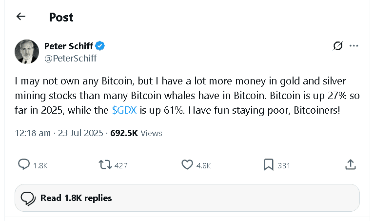 彼得·希夫嘲讽比特币多头:2025年黄金ETF收益碾压加密货币 7