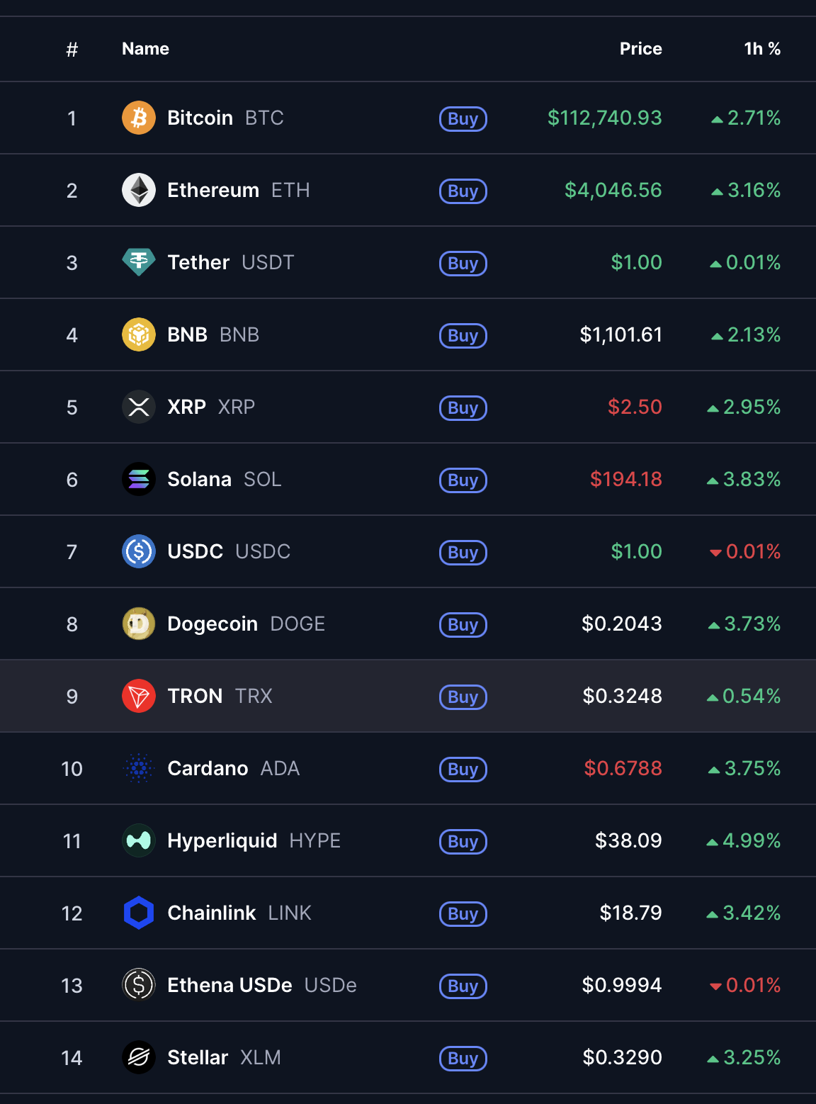 受此消息刺激,加密货币市场普遍走强。CoinMarketCap数据显示,比特币(BTC)过去一小时上涨2.71%至112,740美元,以太坊(ETH)跃升3.16%报4,046美元。Solana(SOL)表现亮眼上涨3.83%至194.18美元,卡尔达诺(ADA)和瑞波币(XRP)分别录得3.75%和2.95%涨幅,BNB延续稳健复苏趋势上涨2.13%。