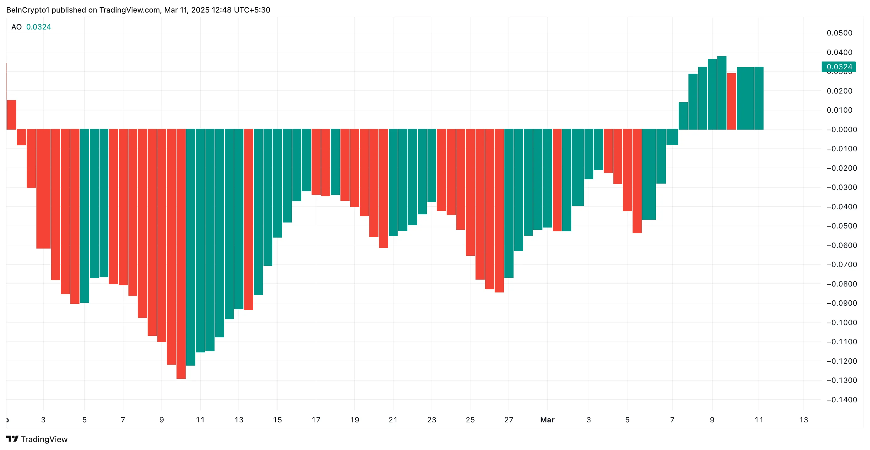 在MOVE/USD的日线图上,altcoin的Awesome Oscillator(AO)指标支持看涨观点。截至发稿时,这一衡量资产市场动能的指标显示为绿色柱状图。