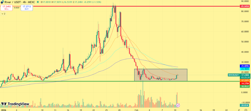 RIVER当前的市场结构可追溯至一月一轮强劲的上涨行情,当时激进的投机兴趣在短时间内大幅推高价格。该轮上涨伴随成交量放大,但缺乏结构性支撑。然而,代币未能维持涨幅,随后出现剧烈的过山车式行情,导致其价格回落至15-17美元左右的较低轨道。在那轮抛售后,RIVER价格稳定在一个狭窄区间内,波动性减弱,方向性信念消失,表明市场正在过热上涨后重新评估价值。