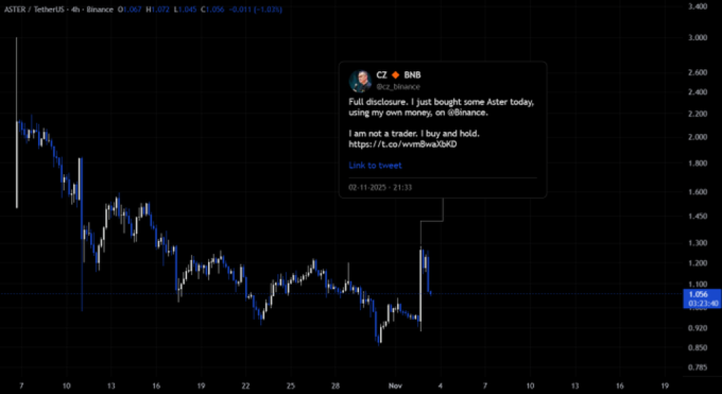 ASTER价格今日攀升至1.04美元附近,成为市场表现最亮眼的代币之一。更令人惊讶的是其交易量——单日暴涨超900%。这种异动往往需要催化剂,而这次的火花来自加密货币界一位家喻户晓的人物。