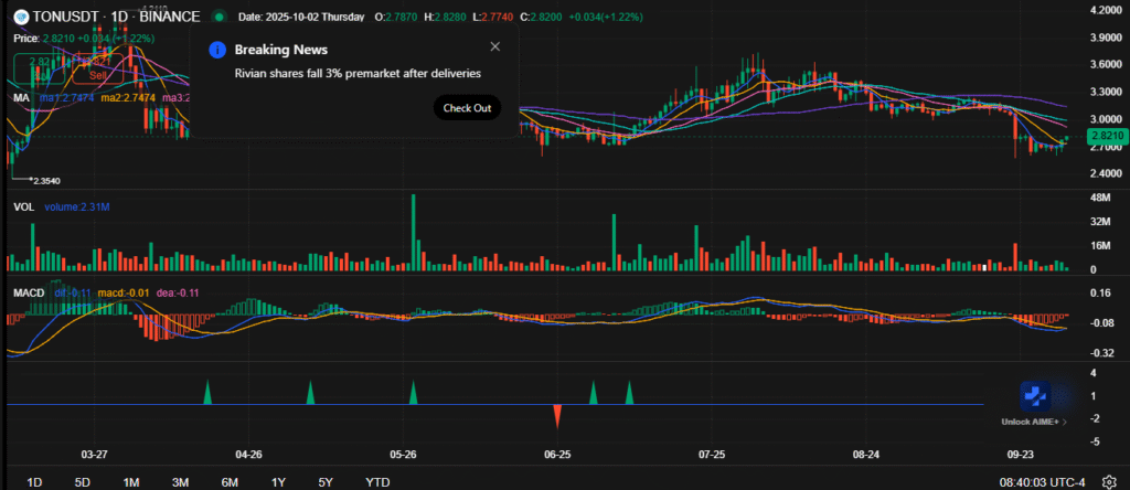 日线图显示TON在2.82美元附近暂获企稳,2.35美元形成支撑,而3美元仍是关键心理关口。有效突破3美元将标志短期情绪的重要转变。