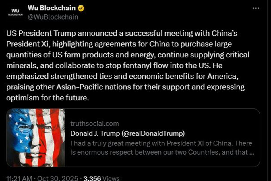 交易所余额下降印证市场长期看涨预期,但10月宏观层面挑战不断。美联储降息后比特币反而下跌,鲍威尔讲话加剧不确定性。当前市场焦点集中于中美元首会晤,中美关税战若正式结束,比特币等风险资产或将在11月实现软着陆。最新报道显示特朗普与习近平已成功会面。