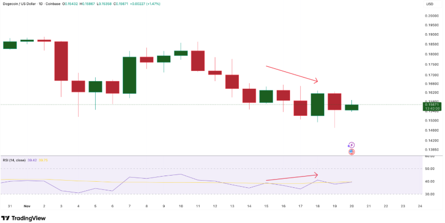 长期持有者抛压加剧:追踪持币超155天钱包的链上数据显示,长期持有者的信念正在崩塌。过去十日(11月9日至11月19日)该群体抛售量激增1.75亿枚DOGE,减持幅度暴增280%。动能衰减叠加"强手"退场,使得短期反弹极易夭折。