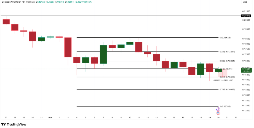 狗狗币(DOGE)现报0.156美元附近,过去一个月累计下跌近19%。虽然部分大盘山寨币正尝试反弹,但狗狗币走势持续偏弱,多项链上数据与技术指标均显示其短期颓势可能延续。