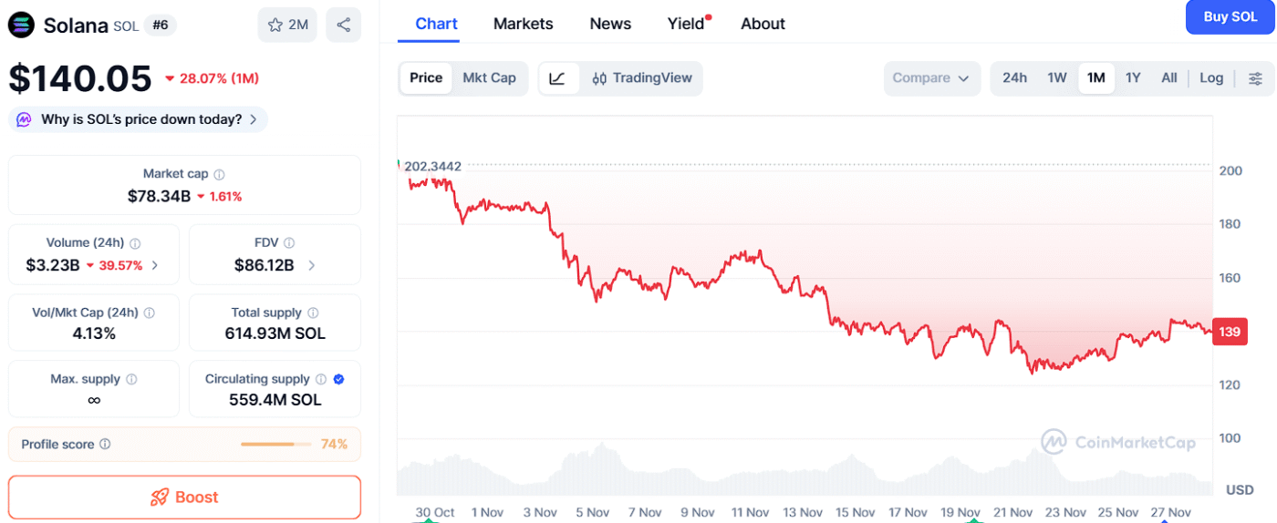 Solana(SOL)目前交易价格约为140美元,通过关键技术区间的持续买盘不断强化其看涨势头。SOL在137美元、129美元和120美元水平获得强力支撑,这些价位持续吸引长期持有者、交易员和生态建设者的资金流入。这些支撑区域为Solana下一轮上涨奠定了坚实基础,特别是在高速网络再度引发市场关注之际。