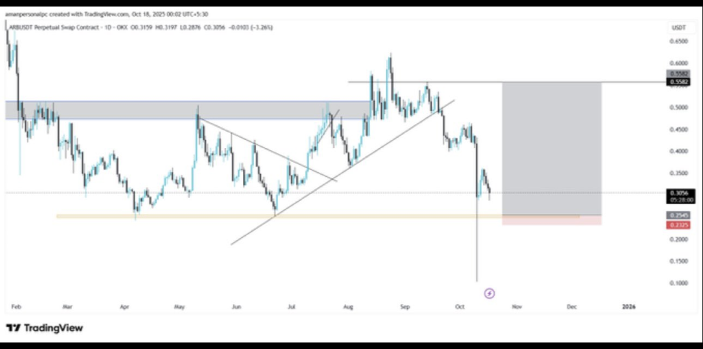 该分析师强调,这种资金流入正引起关注Layer2生态的市场机构的兴趣。他补充指出更多流动性正进入现货市场,而非仅集中在衍生品领域。随着市场波动期间用户寻求更低成本的交易网络,围绕生态代币的交易情绪已显著改善。多家机构正在观察$ARB能否站稳0.30美元关口,进而冲击0.58美元目标区域。