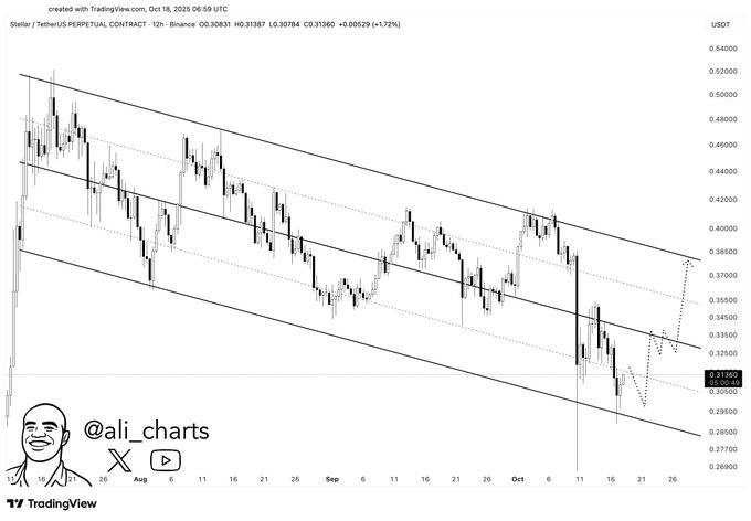 分析师Ali分享的最新12小时周期图表显示,自7月下旬以来,XLM/USDT始终在一个形态完整的下降平行通道内运行。该通道上下轨持续影响着价格的短期反转走势。