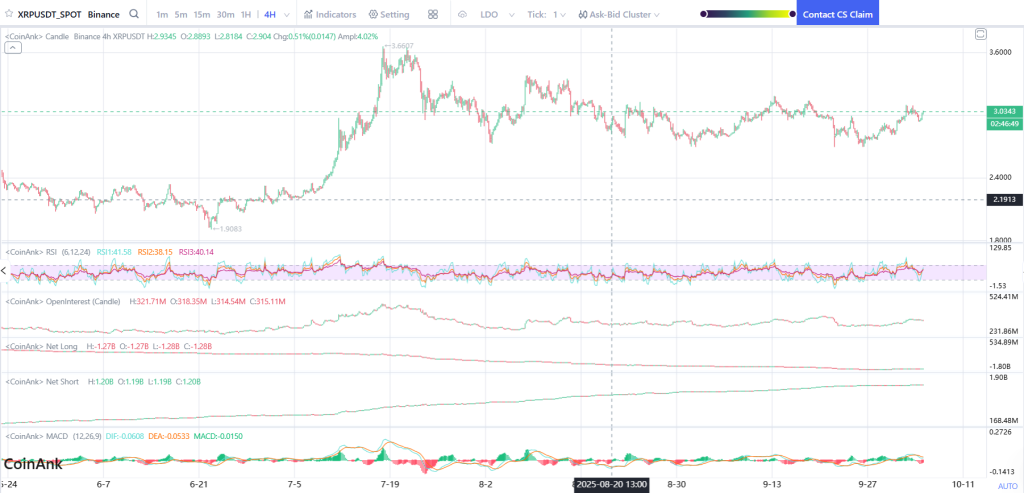 从4小时图来看,XRP价格明显处于蓄势状态。在冲高至3.66美元后回落,目前维持在2.80-3.10美元的宽幅震荡区间。这种形态通常预示着突破前的准备。3.03-3.10美元区域仍是强阻力位,若能有效突破将快速测试3.30-3.40美元区间。但若多头失守2.80美元支撑,下一重要支撑位将下看2.20美元。