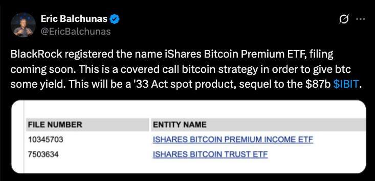 关键信息显示,贝莱德通过在特拉华州注册信托公司的方式为比特币溢价收益ETF提交申请,这通常是向美国证券交易委员会(SEC)递交正式文件(S-1或19b-4)的前置步骤。分析师认为,该基金将通过出售比特币期货备兑看涨期权或相关衍生品来创造收益,其盈利模式聚焦波动性溢价而非单纯跟踪价格。