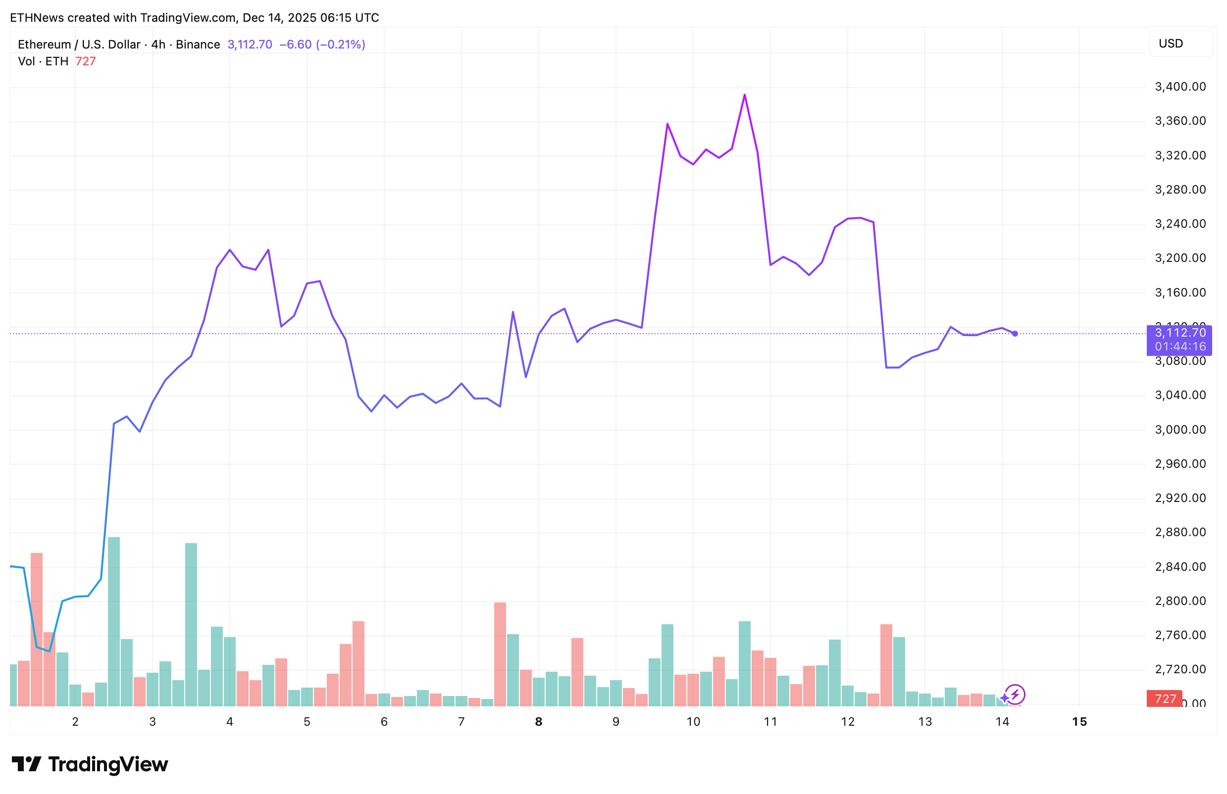 过去数日以太坊价格持续在3100美元区间震荡。4小时价格图显示其在3250美元至3050美元间多次摆动后,逐渐进入波动收窄的企稳阶段。这种收敛形态通常预示着市场正在为方向性突破做准备。