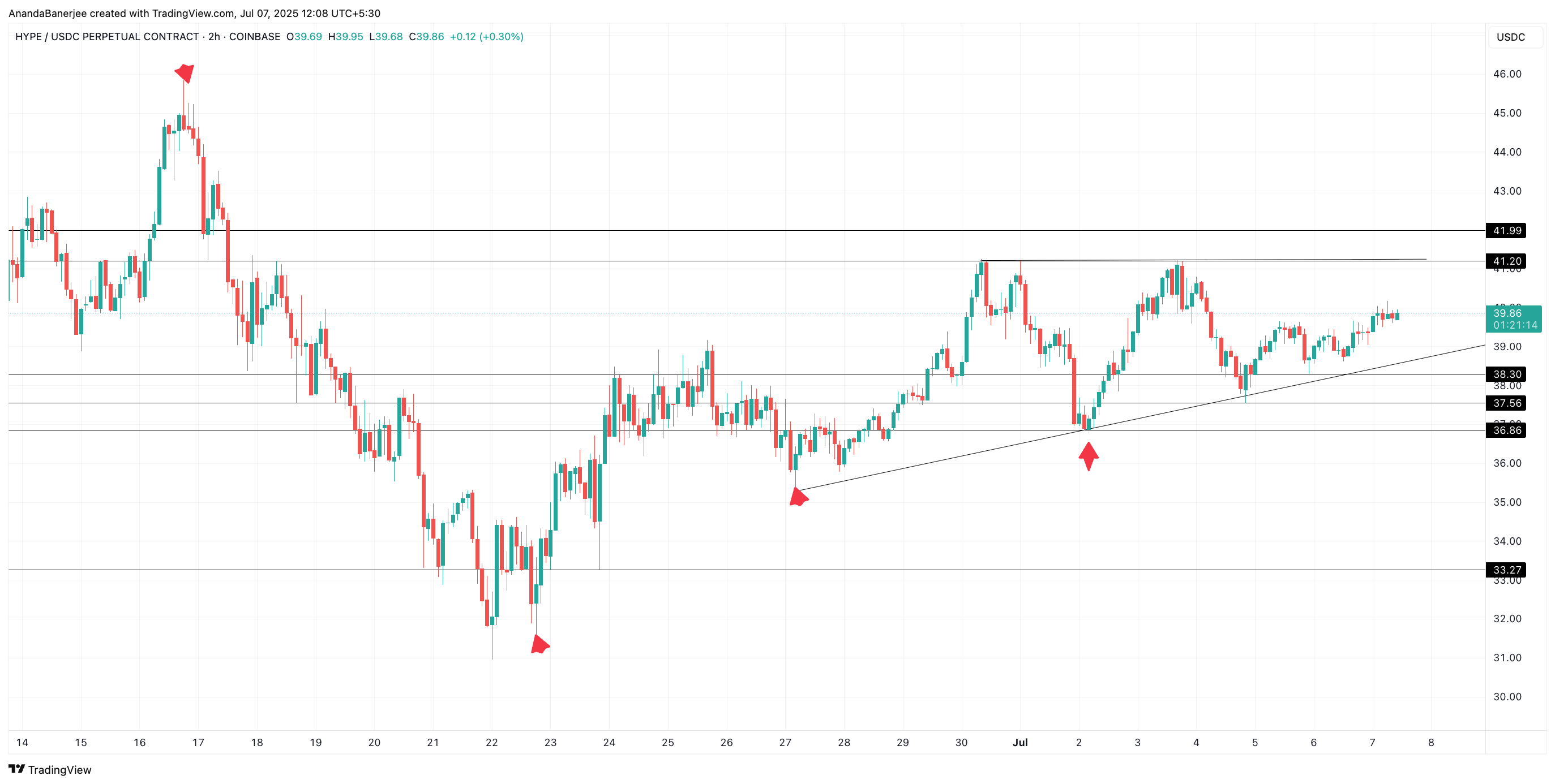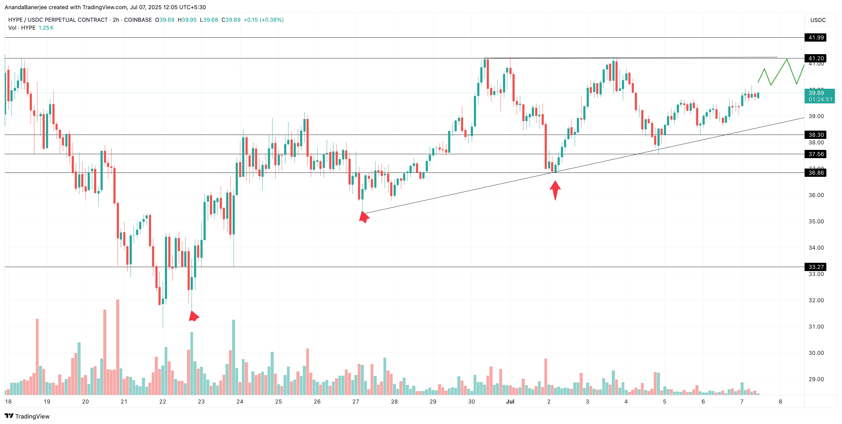 当前结构仅在CMF跌破零轴且价格失守37.5美元时才会失效。在此之前,每次回调都被强势买入。四小时时间框架内,HYPE自6月27日以来持续形成更高的低点,41美元附近构筑阻力。若带量突破楔形上轨并站稳42美元,空头可能遭遇剧烈挤压。