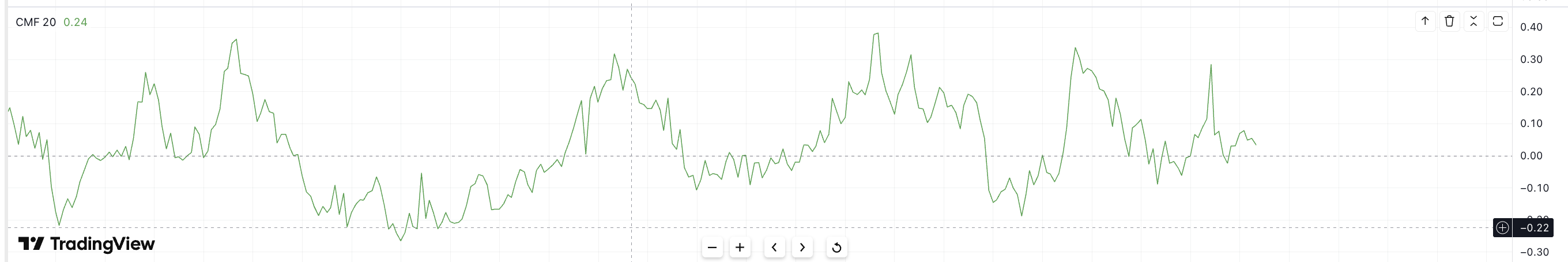 追踪量能加权资金流的Chaikin Money Flow(CMF)指标持续位于零轴上方,显示买盘力量稳固。CMF不同于测量动量的MACD,它直接反映真金白银的流向——在横盘整理阶段保持正值,意味着聪明钱正趁价格稳定时持续累积。
