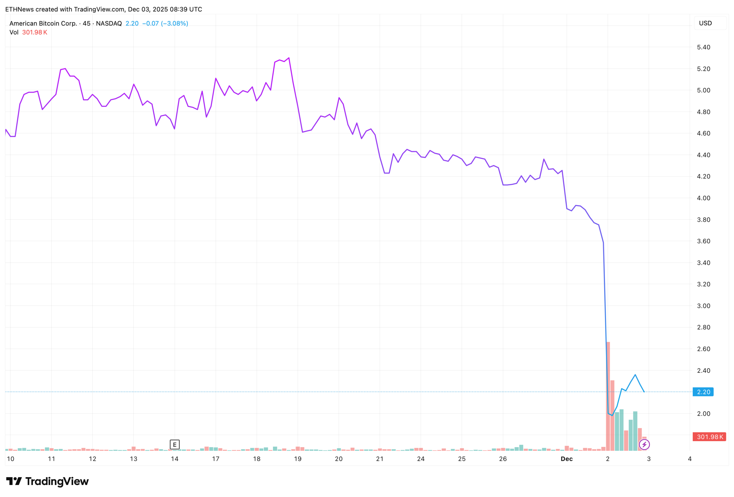 图表显示抛售几乎瞬间爆发,ABTC在巨量交易中从4美元上方迅速跌至2美元低档区间。这一走势反映出严重的流动性失衡,在股价尝试小幅反弹前,卖盘压力完全压倒了买方支撑。