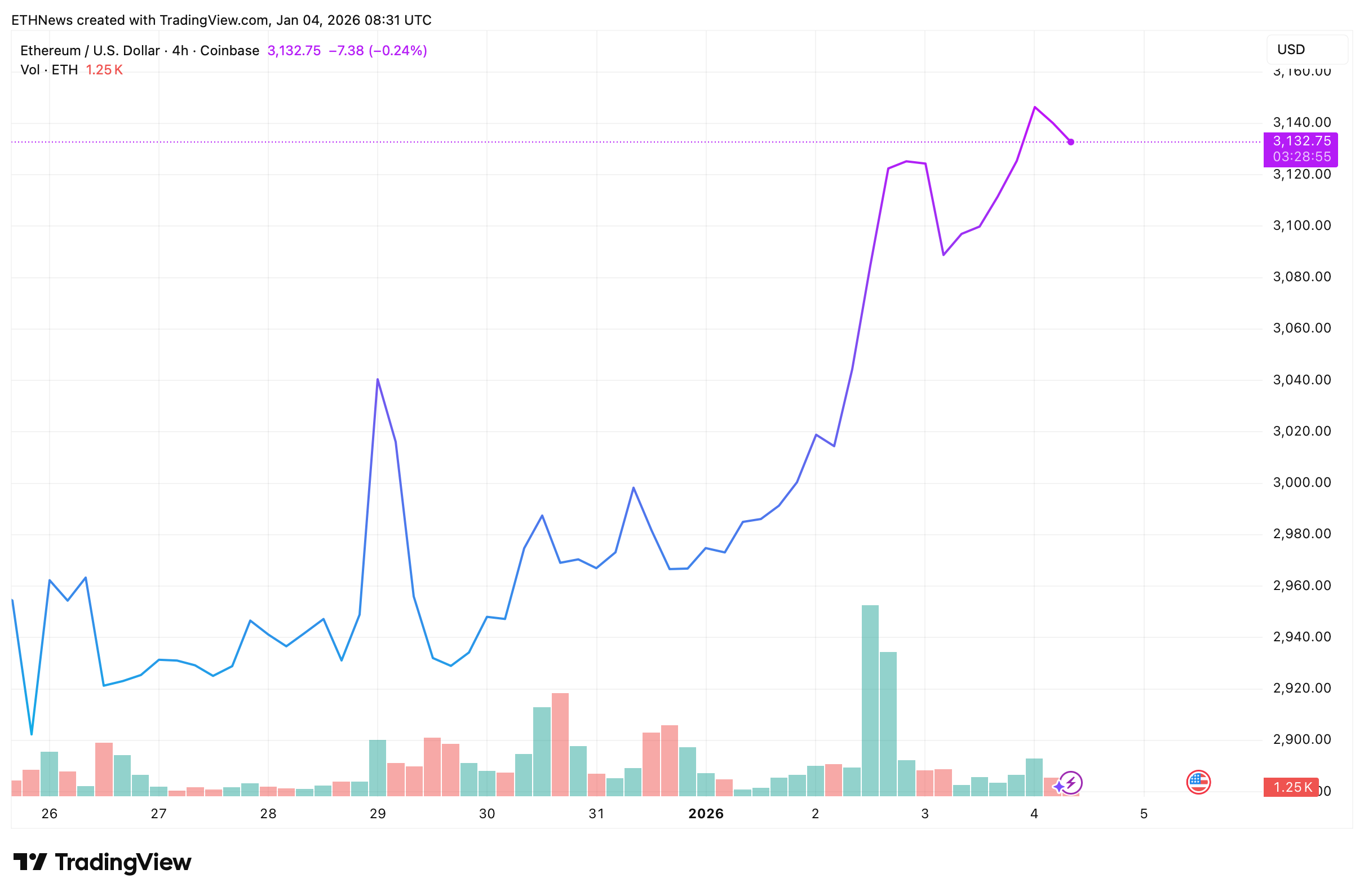 四小时 TradingView 图表显示,自12月29日以来以太坊已确立明确的高点低结构。在3000美元下方整固后,价格于一月初开始走高,最终重新夺回3100美元区域。