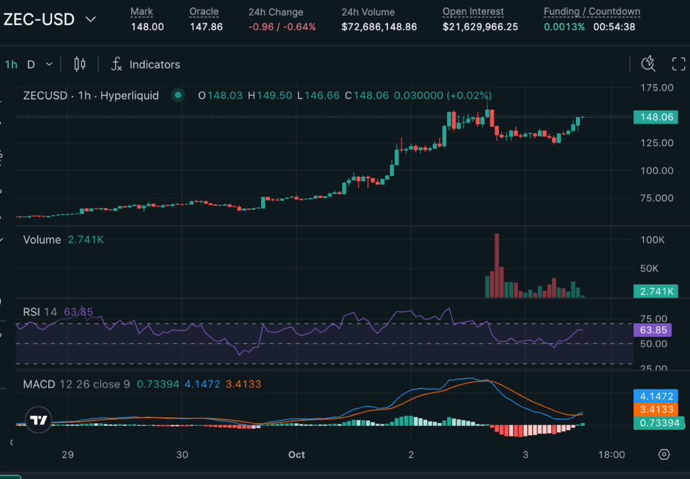 Hyperliquid数据显示,ZEC价格最高触及171.05美元后回落至150美元附近,过去24小时仍上涨4%。随着更多买家涌入,交易活动激增,使ZEC成为市场焦点,成为过去24小时内表现最强劲的资产之一。