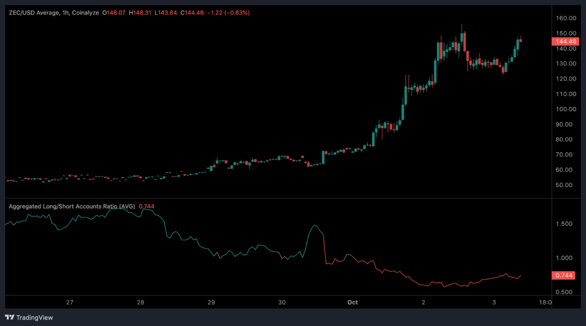 Coinalyze图表显示Zcash快速冲高后进入稳定区间。值得注意的是,尽管价格持续上涨,多空比率却从1.5以上降至0.74左右,这意味着更多交易者开始押注ZEC下跌,尽管价格走势仍保持强劲看涨态势。