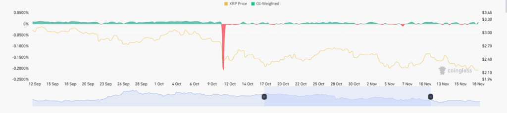 在该事件后,XRP尝试温和反弹期间资金费率维持小幅负值。此阶段的价格波动很可能来自现货需求而非杠杆活动。至11月中旬,随着交易者降低风险敞口且市场环境趋于稳定,资金费率重回中性水平。