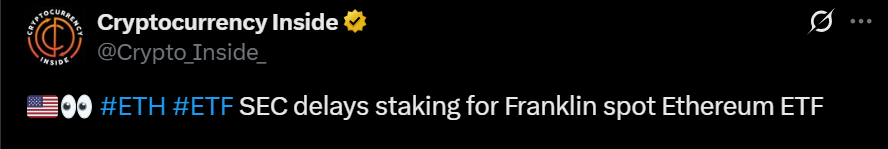 美国SEC推迟对富兰克林以太坊ETF质押提案的决策,可能导致以太坊价格下跌。