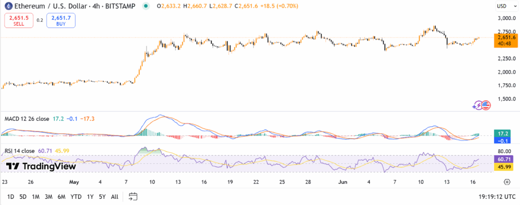 4小时图表显示以太坊价格在2,500至2,750美元区间横盘震荡。2025年6月16日现报2,651.60美元。近期跌破2,600美元后迅速被买盘托起,形成短期更高低点,表明多头正力守该支撑位。