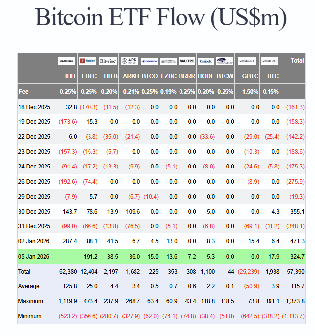 现货比特币ETF在1月5日录得自10月加密货币市场下跌以来最大的单日净流入,规模近7亿美元。根据Farside Investors的数据,美国现货比特币ETF当日净流入6.97亿美元,其中贝莱德的IBIT以3.72亿美元的流入额领先。