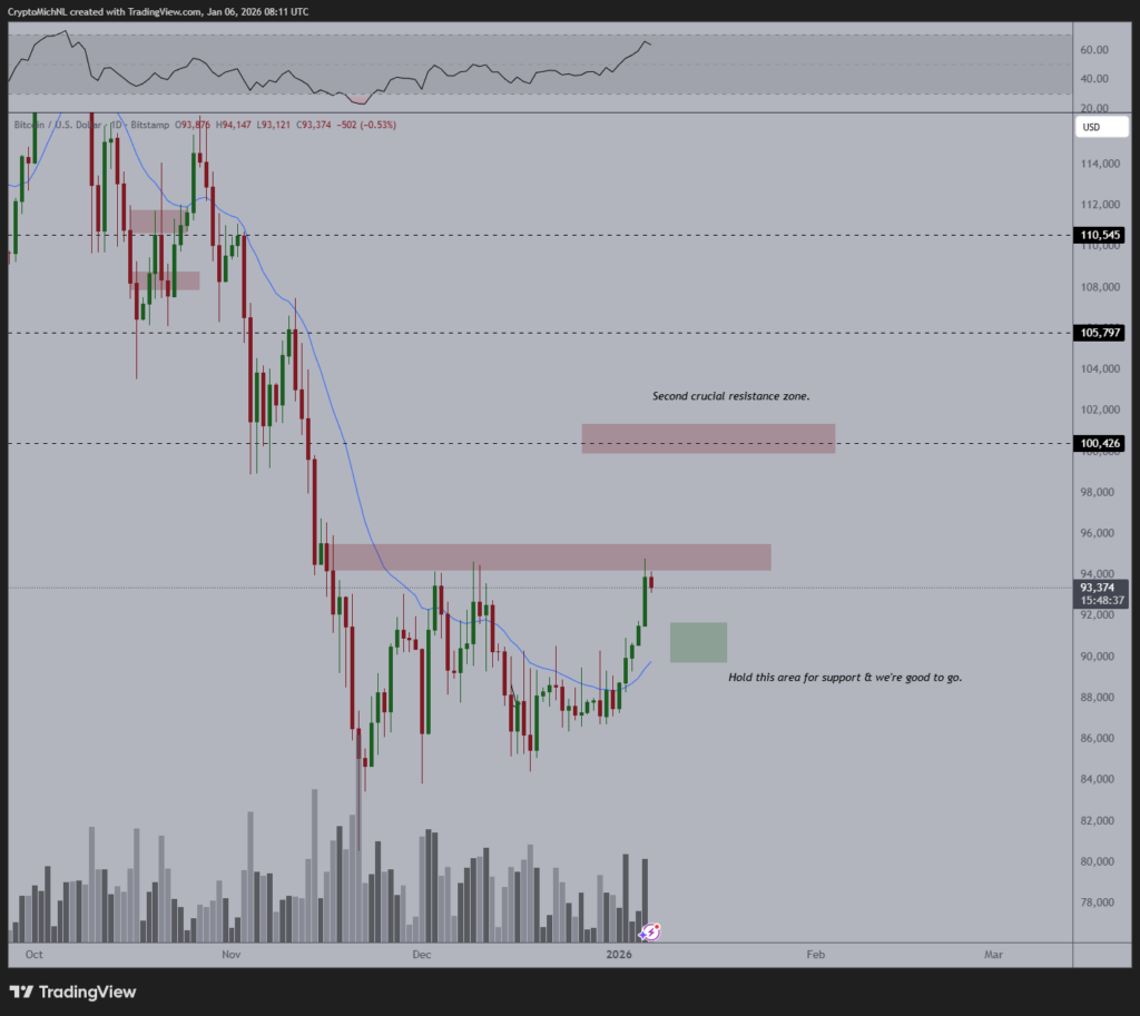 加密货币分析师泰德·皮洛斯认为比特币价格正在收复关键价位。若日线能持续收于该区域上方,BTC有望在数周内推升至10万美元。然而,如果多方未能守住涨势,BTC可能会跌至9万至9.1万美元的支撑区间。