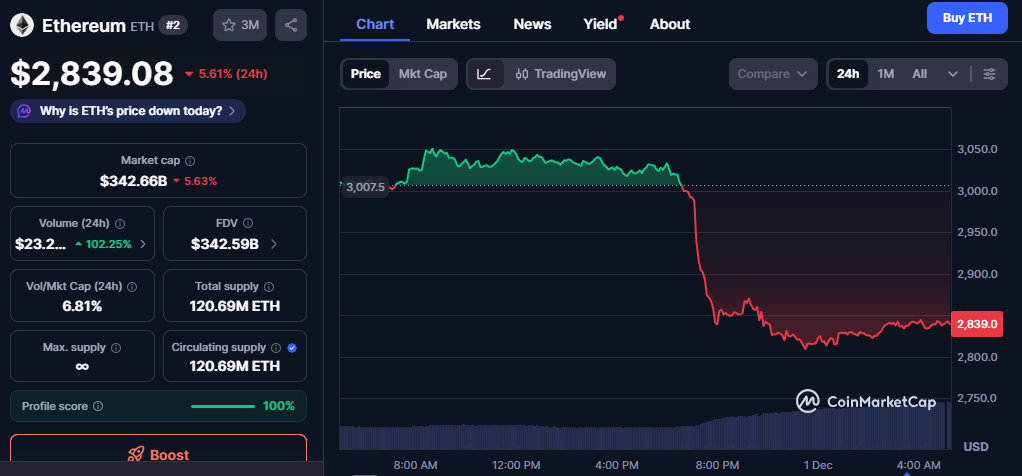 过去24小时内以太坊跌幅超6%,现报2839美元附近。随着资产价格跌破3000美元关口,短期动量出现显著转变。近30日累计27%的跌幅表明,以太坊仍面临持续抛压。