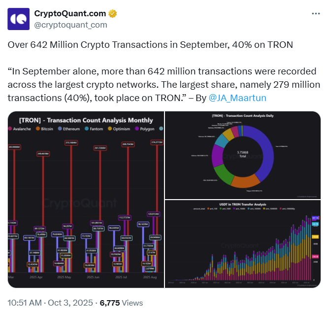 最新数据显示,波场已成为区块链交易活动的领导者。2025年9月期间,比特币、以太坊、Polygon、Arbitrum、TON等主流公链共完成6.42亿笔交易,其中波场独占43.5%的份额。