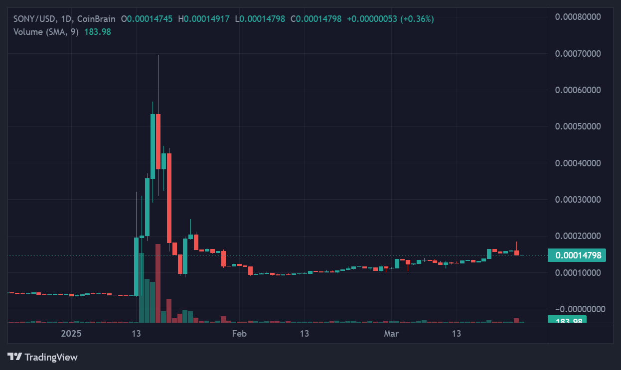 尽管有这些消息,Soneium的代币SONY在过去24小时内下跌了17%,目前触底至0.00014美元,自1月峰值0.0007美元大幅下跌后一直在该水平附近盘整。